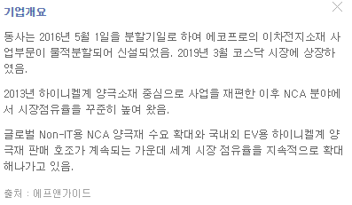 -동사는 2016년 5월 1일을 분할기일로 하여 에코프로의 이차전지소재 사업부문이 물적분할되어 신설되었음. 2019년 3월 코스닥 시장에 상장하였음. 2013년 하이니켈계 양극소재 중심으로 사업을 재편한 이후 NCA 분야에서 시장점유율을 꾸준히 높여 왔음. 글로벌 Non-IT용 NCA 양극재 수요 확대와 국내외 EV용 하이니켈계 양극재 판매 호조가 계속되는 가운데 세계 시장 점유율을 지속적으로 확대해나가고 있음.
