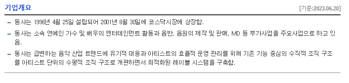 -동사는 1996년 4월 25일 설립되어 2001년 8월 30일에 코스닥시장에 상장함. 동사는 소속 연예인 가수 및 배우의 엔터테인먼트 활동과 음반, 음원의 제작 및 판매, MD 등 부가사업을 주요사업으로 하고 있음. 동사는 급변하는 음악 산업 트렌드에 유기적 대응과 아티스트의 효율적 운영 관리를 위해 기존 기능 중심의 수직적 조직 구조를 아티스트 단위의 수평적 조직 구조로 개편하면서 최적화된 레이블 시스템을 구축함.