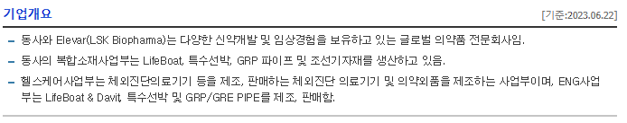 -동사와 Elevar(LSK Biopharma)는 다양한 신약개발 및 임상경험을 보유하고 있는 글로벌 의약품 전문회사임. 동사의 복합소재사업부는 LifeBoat, 특수선박, GRP 파이프 및 조선기자재를 생산하고 있음. 헬스케어사업부는 체외진단의료기기 등을 제조, 판매하는 체외진단 의료기기 및 의약외품을 제조하는 사업부이며, ENG사업부는 LifeBoat & Davit, 특수선박 및 GRP/GRE PIPE를 제조, 판매함.