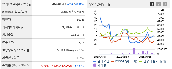 알테오젠 현재 주가는 46,400원이며 전일 대비 -50원의 모습을 보이고 있습니다. 알테오젠의 주주현황을 살펴보면 박순재(외 4인)이 지분 24.63%를 소유하고 있습니다. 알테오젠는 바이오 기업으로 장중 기준으로 주가는 46,400원 입니다. 삼성전자의 시가 총액은 2조4119억 원이며 발행 주식수는 7.59주 입니다. 외국인 보유 비중은 260,377% 이며 장중 거래량은 51,703,106를 기록했습니다. 매출액은 529억 원, 영업이익은 -294억 원을 달성했습니다.
