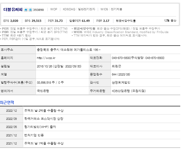 더블유씨피는 전자 장비 및 기기 기업입니다. 대표자는 최원근 이며 설립일은 2016/10/26, 주식 상장일은 2022/09/30입니다. 전체 종업원 수는644명 이고 본사 주소는 충청북도 충주시 대소원면 메가폴리스로 195 -입니다.