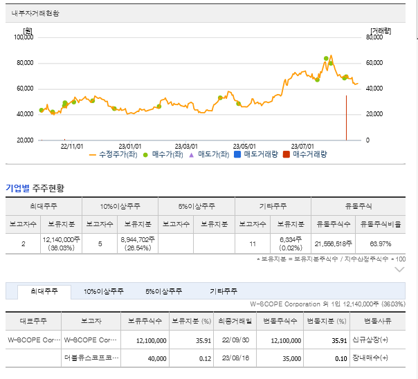 더블유씨피 현재 주가는 64,100원이며 전일 대비 -18.55원의 모습을 보이고 있습니다. 더블유씨피의 주주현황을 살펴보면 W-SCOPE Corporation(외 1인)이 지분 36.03%를 소유하고 있습니다. 더블유씨피는 전자 장비 및 기기 기업으로 장중 기준으로 주가는 64,100원 입니다. 삼성전자의 시가 총액은 2조1802억 원이며 발행 주식수는 5.00주 입니다. 외국인 보유 비중은 105,459% 이며 장중 거래량은 33,696,518를 기록했습니다. 매출액은 1,511억 원, 영업이익은 580억 원을 달성했습니다. EPS는 1,857원입니다.