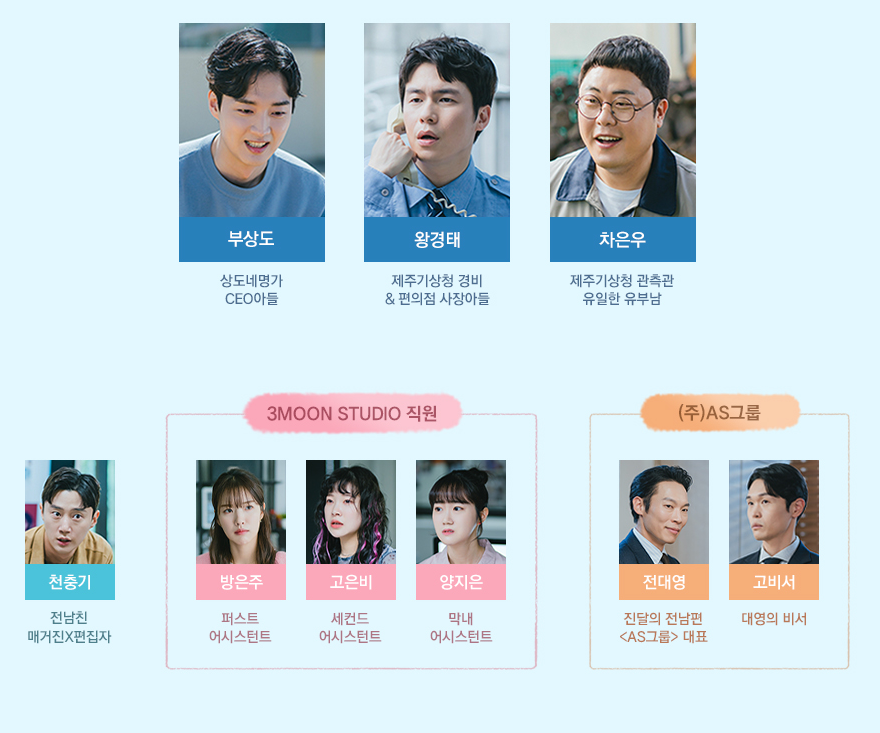 주연 배우로는 지창욱과 신혜선이 참여하고 있으며, 김미경, 서현철, 신동미, 강미나, 김도은, 유오성, 강영석, 이재원, 배명진, 양경원, 백현주, 윤진성, 김아영, 조윤서, 이도혜, 강길우, 김미화 등이 다양한 인물들을 연기하고 있습니다.